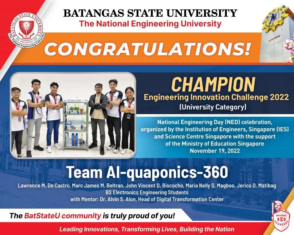 A team of BS Electronics Engineering students from Batangas State University, The National Engineering University victoriously emerged as “CHAMPION University Category” in the recently concluded Engineering Innovation Challenge (EIC) 2022 in Singapore. It was organized by the Institution of Engineers, Singapore (IES) and Science Centre Singapore with the support of the Ministry of Education. The competition commenced in September 2022 and was concluded with a demo and awards presentation during the celebration of Singapore’s National Engineering Day (NED) on November 19. With creativity and innovation, the team topped other finalists from different countries including students from the National University of Singapore and Nanyang Technological University who came second and third respectively. Ai-quaponics-360, Champion, Engineering Innovation Challenge 2022 – University Category Their innovative models were evaluated based on the final product, creativity, design and methodology, originality of the research problem and teamwork. The BatStateU four (4) engineering teams composed of five (5) engineering students and a faculty mentor that made it to the finals of the EIC 2022 under University Category. The team who worked tenaciously on the innovation project, AI-quaponics-360 included Marc James M. Beltran, John Vincent D. Biscocho, Lawrence M. De Castro, Maria Nelly S. Magboo, and Jerico D. Matibag. They used the Internet of Things and Artificial Intelligence (AI) to to create an intelligent small-scale aquaponics system, for the monitoring and control of aquaponics parameters, as well as its botanical and zoological components, innovatively designed for food sustainability and security through home urban farming. Dr. Alvin S. Alon, Head of the Digital Transformation Center, BatStateU mentored the team and resolutely guided them all throughout the competition. The “Merit Awards” in the same category were received by the two other teams from BatStateU with their entries: Intelligence Road Quality Monitoring System with Vibration-Sensing Device and Machine Vision Camera dubbed as AI-Rover by John Lloyd A. Austria, Alyssa Mharbie T. Aleta, Nicole L. Librea, James D. Mondelo, and John Carlo L. Padua, mentored by Dr. Anton Louise P. De Ocampo; and the AI 3D SET GO, an AI-Optimized 3D-Printed Adsorbents Decorated with Waste PET Plastic-Derived Metal-Organic Frameworks for Effective and Sustainable Wastewater Remediation by Lawrence V. Portillo, Alvin D. Javier, Andrea A. Rubia, and Abigayle Vince G. Cruz, coached by Dr. Reymark D. Maalihan. Team EUGTO, which seeks to establish Urban Building Placements and Generating Environmental Impacts Through Artificial Intelligence with student members: Rosselle June M. Asi, Eloiza Jean D. Atienza, Clarisse F. Fajarito, Christine Marie V. Oca, and Abegail B. Pangilinan under the BS Electronics Engineering. They were mentored by Dr. Anton Louise P. De Ocampo, Faculty of Electronics Engineering Department and Head of Electronic Systems Research Center. The BatStateU finalists were supported by the research centers under the Science, Technology, Engineering and Environment Research (STEER) Hub such as the Digital Transformation Center (DTC), Electronic Systems Research Center (ESRC), Material Testing and Calibration Center (MTCC) and the Center for Innovations in Engineering Education (CIEE). Beyond the monetary reward of SGD 8,000.00 for the Champion Team, additional gains were the reward of gaining maturity, building self-confidence, having a greater appreciation of teamwork and professionalism, and an opportunity to develop their potential in providing an innovative solution for a more sustainable future, the inspiration it provides among young Filipino engineers and students even. Truly, Batangas State University, the National Engineering University continuously manifests excellence, creativity and commitment to staying true to its mandates to achieve relevance and create transformative impact through innovations towards a sustainable future.