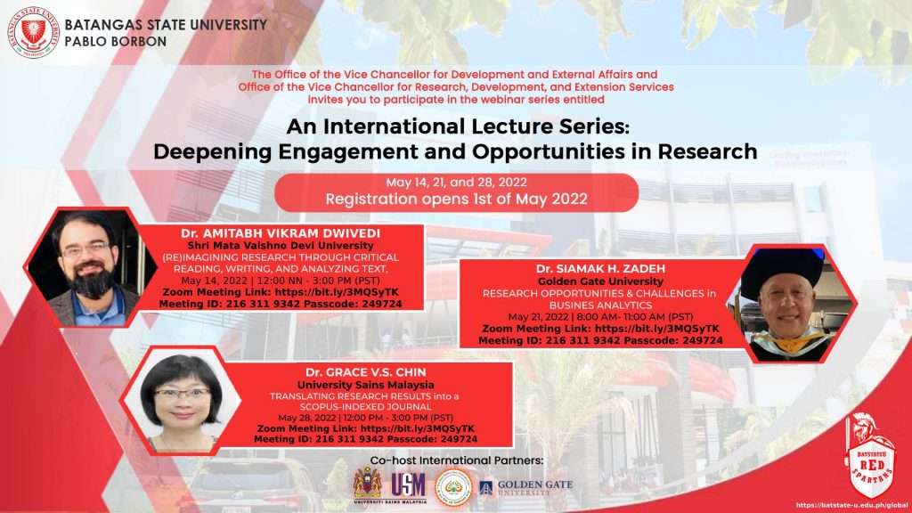 Attention: ALL INTERNATIONAL/FOREIGN STUDENTS Please be informed that the Batangas State University (BatStateU) shall continue holding classes for its international/foreign students ONLINE until further notice. This is to assure learning continuity for international/foreign students who are intending to enroll and/or who are currently enrolled in the University. For further inquiry/ies, you may reach through: Engr. EDZEL GAMAB Director for External Affairs (+6343) 980-0985; 980-0932, loc. 1143 externalaffairs@g.batstate-u.edu.ph Leading Innovations, Transforming Lives #ZitoRedSpartans