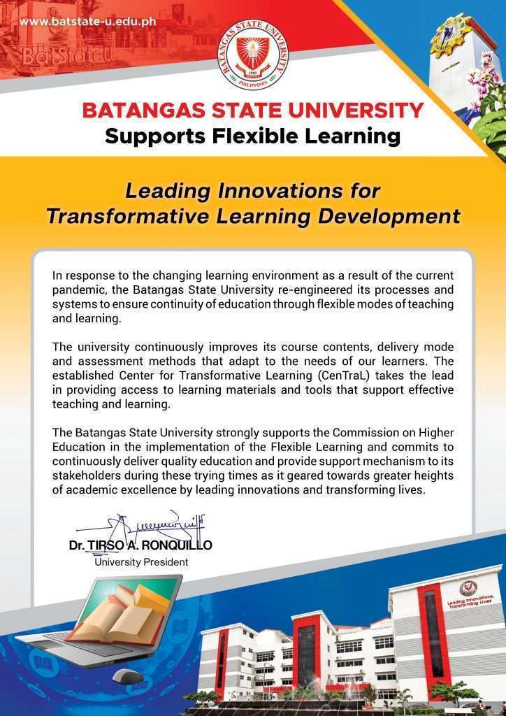 In response to the effects of the COVID-19 pandemic, the University embraced the ‘new norm’ and utilized all available technology and resources to ensure continuous knowledge-sharing between the Red Spartan educators and students. Rising up to the challenge, Batangas State University supports the Commission on Higher Education in the implementation of Flexible Learning, as it positions itself at the forefront of Leading Innovations for Transformative Learning Development. #BatStateUSupportsFlexibleLearning #LeadingInnovations #TransformingLives #ZitoRedSpartans