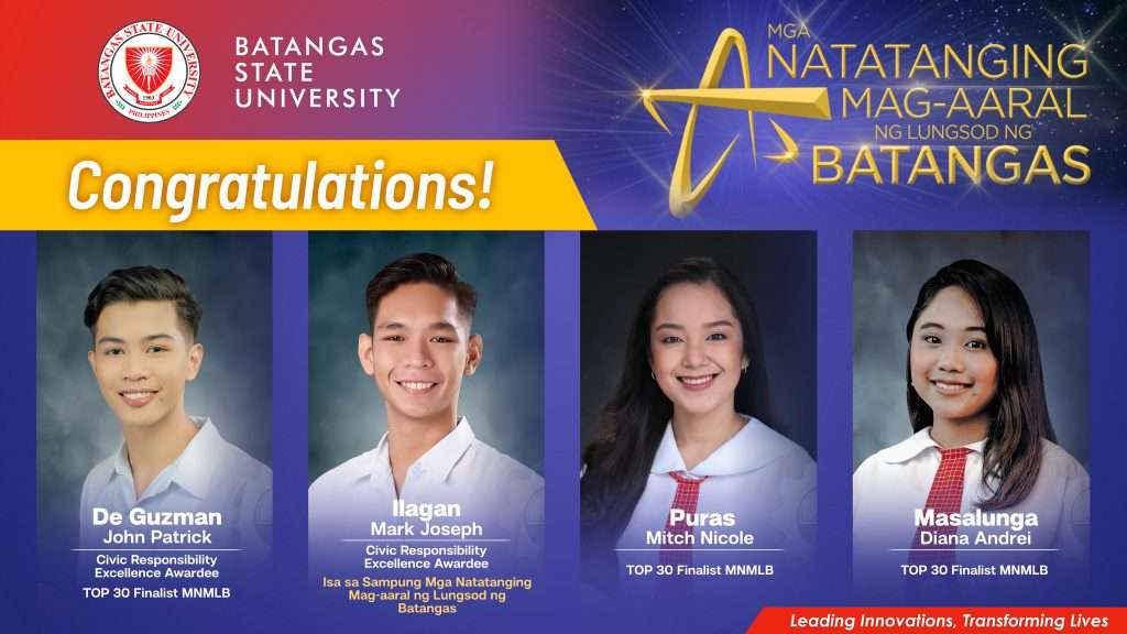 After a two-month, stringent screening process, the most outstanding students of Batangas City were recognized in virtual awarding ceremonies streamed live via Facebook, August 27, 2021. The 2021 Mga Natatanging Mag-aaral ng Lungsod ng Batangas (MNMLB) awardees include four (4) students from the Batangas State University Integrated School-Senior High School (IS-SHS), shortlisted from over 60 student-aspirants all over Batangas City. Aside from being an Awards and Formation Program, the Mga Natatanging Mag-Aaral ng Lungsod ng Batangas (MNMLB) brands itself as a community dedicated to empowering young Batangueños in community and nation-building. It is organized by (Junior Chamber International) JCI Batangas Caballero, City Youth Development Council of Batangas, SK Federation – Batangas City, DepEd Division of Batangas City, and the Ten Outstanding Students of the Philippines – CALABARZON. The four outstanding students from BatStateU are Mark Joseph G. Ilagan, Diana Andrei M. Masalunga, John Patrick G. De Guzman, and Mitch Nicole M. Puras. They are among the finalists of the MNMLB, which aims to inspire and mold young Batangueño students in taking part in community and nation-building. Ilagan was selected as one of the top Ten Outstanding Students of Batangas City. He said he felt fulfilled to be recognized as one of the top students in the city, which somehow served as a summary of many life-changing experiences he had throughout his high school life. “Although it is my name that is linked to being one of the ten Mga Natatanging Mag-aaral ng Lungsod ng Batangas, I believe that I also share this recognition with the people and mentors I worked with from the beginning. Without their guidance, I think I would not be able to develop myself as an outstanding student,” he said in an interview. Furthermore, Ilagan, together with De Guzman, emerged as recipient of the Civic Responsibility Excellence Award, which acknowledges students who have established their leadership concerning the community and society by contributions through outreach programs and community extension projects. Moreover, De Guzman expressed that he felt proud after being recognized for the Civic Responsibility Excellence Award. “It felt very nice to know that my works for the youth were recognized and celebrated. It has also motivated me to do better and strengthen my commitment to service,” he stated in an interview. Meanwhile, the IS-SHS student awardees also received the Youth Leadership Excellence Award, which is given to all finalists, crediting their leadership skills and service to the youth. Diana Andrei M. Masalunga claimed that she is blessed and honored to represent BatStateU in striving for a huge award like MNMLB, having the opportunity to share the lessons and values she learned as a Batang IS with other students in Batangas. On the other hand, Mitch Nicole M. Puras, when asked about what she brought with her throughout her journey in MNMLB, stated that hardships will always be worthwhile. “Just keep in mind that success is a journey, not a destination, and we are currently on that journey,” she cited. This is the first organized search for outstanding students of Batangas City, and the organizers plan to continue the program in the future.