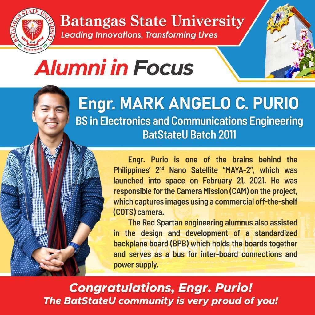 “Mahirap lang kami eh.” Engr. Mark Angelo Purio shared during the Batangas State University Alumni In Focus virtual interview as he looked back on his roots and humble beginnings from being a simple ‘probinsyano’ to becoming one of the lead innovators in the field of space science today. Purio is one of the brains behind the Philippines’ second cube satellite (CubeSat) Maya-2 that was successfully launched to the International Space Station (ISS) this February 21. He was responsible for the Camera Mission (CAM) of the BIRDS-4 Satellite Project which captures images and serves as the eye of the satellite from space. He also assisted in the design and development of a standardized backplane board (BPB) which holds the boards together and serves as a bus for inter-board connections and power supply. The developers of Maya-2, including Purio, are Department of Science and Technology (DOST) scholars pursuing doctoral degree programs in Space Engineering in Kyushu Institute of Technology (Kyutech) in Japan. That’s why he proudly calls himself a living embodiment of being an “Iskolar Para sa Bayan”; Purio is a consistent DOST scholar from college through his current doctoral degree. He is a Batangas State University alumnus who graduated with a degree in Bachelor of Science in Electronics and Communications Engineering and continued to gain his masteral studies in Electronics Engineering at De La Salle University, and currently a Ph.D. candidate at Kyutech. He revealed that his interest in space engineering only came in later, and it was his interest in math, science and technology that led him to studying Electronics and Communications Engineering in BatStateU. But he admits it wasn’t always an easy feat in financial terms. “When I was in high school, hindi ako sure if I will be able to…kung makakaya pa na makapag-college ako,” he said. (When I was in high school, I was not sure if I will be able to…if it’s within our means for me to enter college.) But given what he has accomplished now, Purio hopes to inspire people, especially the students, to dream big and aspire high. “Regardless of what situation you are in right now, if you have a dream that you want to pursue, don’t be afraid to take risks. If you don’t have the resources right now, just pray to God and He will give you the resources to push through.” he said. The University President Dr. Tirso Ronquillo personally congratulated Engr. Purio in a separate virtual ‘kumustahan’ meeting together with Engr. Albertson Amante, Vice President for Research, Development, and Extension Services and Engr. Ralph Sangalang, all of whom are Purio’s former professors during his undergraduate years at BatStateU in the Electronics Engineering Department. Purio described President Ronquillo as a “compassionate” and “considerate” professor. And just like from when in college upto now, Pres. Ronquillo still has a posed challenge for Purio as BatStateU alumnus. “Beyond all the accolades, beyond all the recognitions, there has to be translation. We are always recognized for one doing this and that or one excelling here and there, but it has to be translated. That is my challenge.” With that, Purio expressed his gratitude to the university for the foundation and skill set in engineering that BatStateU had instilled in him to prepare his launch to the career path he has chosen. “Malaking part ‘yung Batangas State University for me kasi doon na-steer ‘yung curiosity ko. Do’n din na-hone ‘yung skills ko.” (The years I have spent with Batangas State University is a huge part of my success because it is through the university that I was able to steer my curiosity and hone my skills.) Moreover, Pres. Ronquillo asked for Engr. Purio’s support to the university’s vision in positioning itself to become a premier national university, especially now that the BatStateU is nearing their launch of new engineering programs, one of which is Aerospace Engineering. Purio is also hopeful for future plans and partnerships with the university. He ultimately plans to give back to his roots and serve the country through continuous participation in various efforts and collaboration in the field of space science.