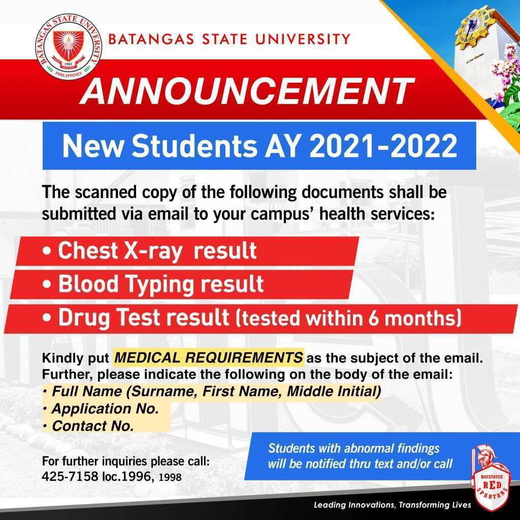 ANNOUNCEMENT! For incoming First Year students for the Academic Year 2021-2022. Face to face physical examination is waived. However, the scanned copy of the requirements shall be submitted to the health services office of your campus from May 10 – August 9, 2021. Click here for the list of email addresses of your respective campus assignments. For further inquiries, please call 425-7158, loc. 1996/1998 Thank you!