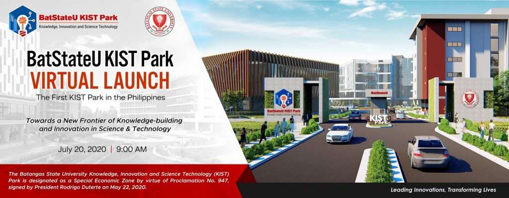 BatStateU KIST Park was proclaimed as Special Economic Zone through Proclamation No. 947, s. 2020. Visit the Official BatStateU KIST Park website at http://batstateukistpark.com.ph and follow us on Facebook (@BatStateUKISTPark) and Twitter (@BatStateUKIST).