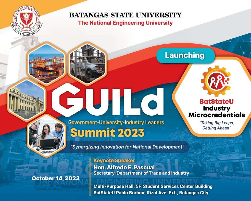 BATANGAS CITY — On October 14, the “GUILd Summit 2023” set the stage for a pioneering era in transformative learning as Batangas State University (BatStateU), The Philippines’ National Engineering University, unveiled its Microcredentialing Program. This significant event, held in the spotlight of the GUILd Summit 2023, marks a paradigm shift in education and career development, offering a range of cutting-edge industry microcredential courses. The BatStateU Industry Microcredentials allows learners to upskill through specific, innovative, and high-quality courses, ensuring that their learning is targeted and effective. What sets these microcredentials apart is its industry relevance being co-developed and co-delivered by the University with the industry, thereby offering competencies highly valued in the job market and making graduates more competitive. Learners earn verifiable digital badges upon completion, granting them a distinct advantage in their professional journey. Parallel to this, microcredentials empower individuals to personalize their career pathways with stackable and flexible options that align with their unique goals and ambitions. Dr. Tirso A. Ronquillo, President of Batangas State University, joined by Hon. Alfredo Pascual, Secretary of the Department of Trade and Industry, led the official launching of BatStateU Industry Microcredentialing Program, signifying a momentous stride toward a future where education remains in sync with industry demand. Highlighting the milestone was the signing of agreements with the University’s microcredential industry partners, namely Microsoft PH, CGTD, Inc., CISCO Philippines, Geodata Systems Technologies, Inc., and CIM Technologies, Inc. The portfolio of programs comprises a diverse range of fields, spanning from Data Science, Cybersecurity, and Internet of Things to Building Information Modeling, Geographic Information System, and Construction Project Planning, among others. Dr. Ronquillo shared, “As the Philippines’ National Engineering University, we are committed to leading innovations through transforming education to meet the evolving needs of our students and industry partners. This launch of the BatStateU Industry Microcredentials represents a significant milestone, a testament to our dedication to equip learners with valuable, real-world skills. These microcredentials are designed to empower individuals to excel in their careers, bridging the gap between education and employment.” “We are proud to partner with leaders in the industry who share our vision for a more dynamic and competitive workforce. Together, we are unveiling the future of transformative learning,” Dr. Ronquillo added.” The GUILd Summit 2023 served as a platform for the convergence of government, University, and industry leaders, advancing an environment for comprehensive dialogues across four transformative thematic domains (i.e. Next-Generation Infrastructure, Manufacturing, and Trade; Digital Innovations and ICT Transformation; Health, Biotechnology, and Nutrition for Tomorrow; Climate Resilience and Sustainable Ecosystems) that are instrumental in shaping the global landscape. This also featured a lineup of eminent speakers and thought-provoking sessions, including a keynote address by Sec. Alfredo E. Pascual. His address, titled “Educate, Legislate, Innovate: A Blueprint for Tripartite Synergy,” provided valuable insights on the critical roles of the academe, government, and industries in fostering collaboration towards innovation, followed by engaging panel discussions on the Philippines in the global value chain, industrialization strategies, and the profound impact of microcredentialing across diverse industries. Batangas State University is the Philippines’ National Engineering University by virtue of Republic Act No. 11694; renowned for its engineering education excellence, this Level-IV state university has produced over 180 engineering board topnotchers, cementing its position as the country’s largest engineering university. Notably, BatStateU is the first and, thus far, the only state university in the Philippines with engineering and computing programs accredited by ABET’s Engineering Accreditation Commission and Computing Accreditation Commission. Batangas State University. (BatStateU) has earned three stars in the QS Stars Rating. Furthermore, it was ranked as the 351st World’s Most Sustainable University in the 2022 UI GreenMetric World University Rankings and is also recognized as the 90th most innovative University globally in the prestigious World University Rankings for Innovation (WURI) 2023 and secured a notable ranking between 601st-800th among 1,591 universities from 112 countries/regions in the THE Impact Rankings 2023. Learn more about BatStateU Industry Microcredentials here: https://batstate-u.edu.ph/microcredentials/
