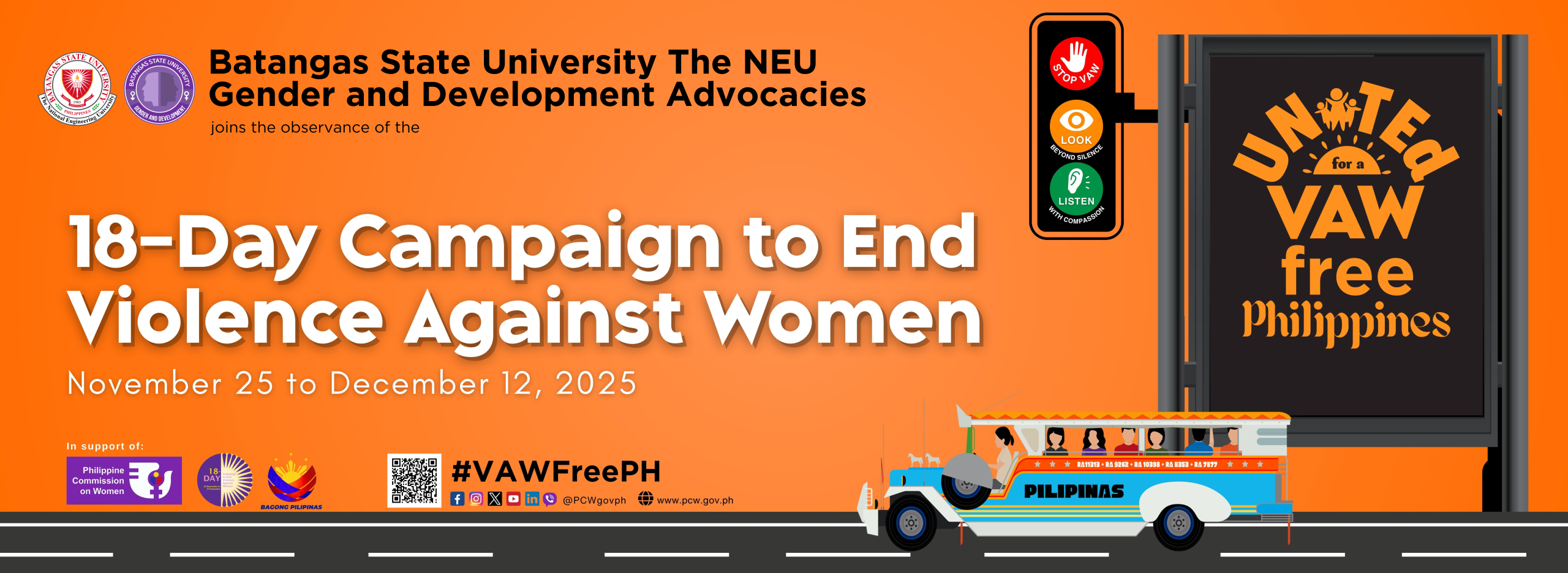 Batangas State University, The National Engineering University (BatStateU The NEU), through its Gender and Development Advocacies Office, joins the nationwide observance of the 18-Day Campaign to End Violence Against Women (VAW), running from November 25 to December 12, 2025.