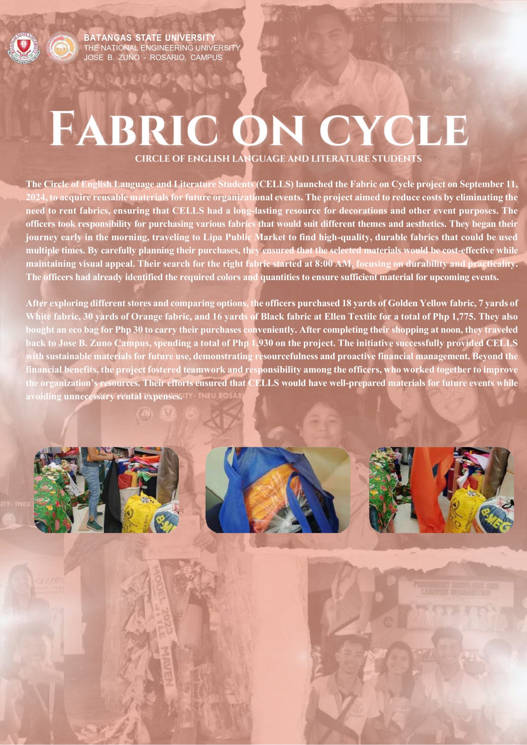 The Society of Aspiring Managers (SAM) organization launched an initiative to expand their sources of funds for the whole academic year 2024-2025 through their Income Generating Project: kaSAMa Apparel. This activity aims to produce an additional source of budget to support the allocation of funds for the activities conducted by the mother organization of the CABEIHM department. Likewise, one of its goals was to provide monetary support for any other expenses associated with multiple events.