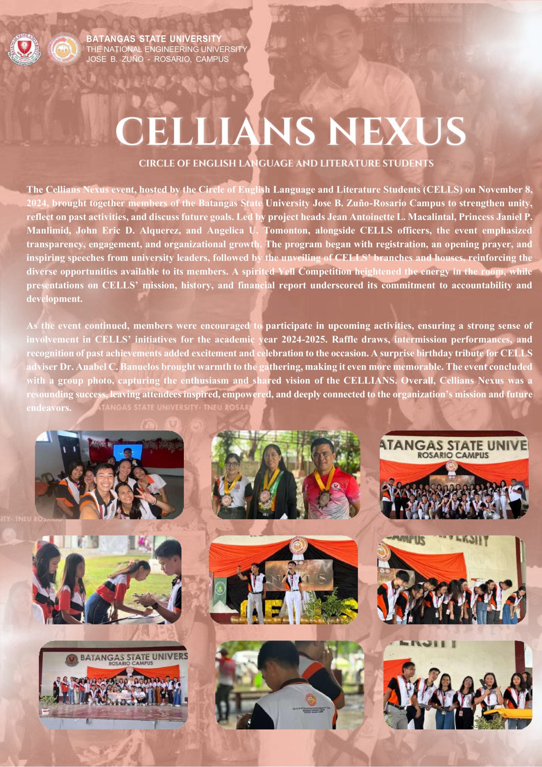 Ensuring to be an alliance of its members from Batangas State University - The National Engineering University, Rosario Campus pursuing academic excellence as well as its social, mental, spiritual, and emotional development of the registered members.