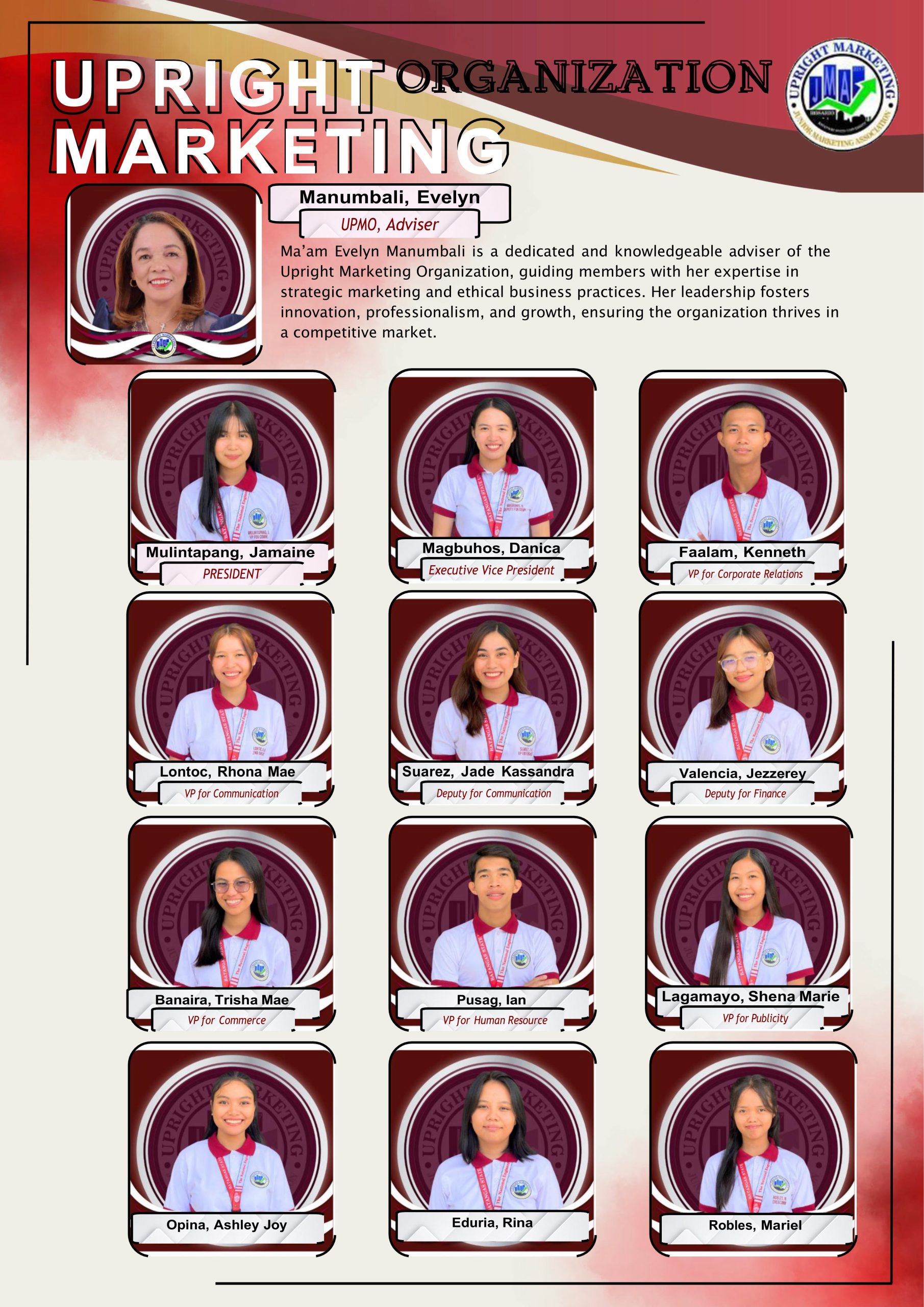 UPRIGHT MARKETING ORGANIZATION is an organization that leads and conducts several activities, both academic and non-academic. It is comprised of group of executives from the marketing management department who hold specific positions and responsibilities with the aim of developing and enhancing the potential of every student and showcasing their capabilities in all aspects of becoming better individuals. This organization also involves cooperation and participation among all marketing students in joining every activity or event that will definitely build great experiences and positive connections among each other as true Marketistas.
