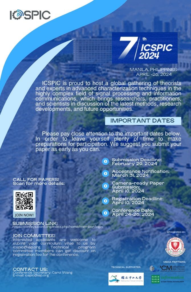 Batangas State University (BatStateU), The National Engineering University is proud to announce the 7th International Conference on Signal Processing and Information Communications (ICSPIC 2024), to be held in Manila, Philippines from April 24 to 26, 2024. Organized by BatStateU, this esteemed conference serves as a platform for theorists and experts in signal processing and information communications to convene and exchange insights on advanced characterization techniques. ICSPIC 2024 invites researchers, practitioners, and scientists to submit papers on a wide range of topics, including but not limited to: Adaptive Filtering & Signal Processing, Ad-Hoc and Sensor Networks, Analog and Mixed Signal Processing, Array Signal Processing, Audio and Electroacoustics, Bioimaging and Signal Processing, Cryptography and Network Security, Design and Implementation of Signal Processing Systems, Optical Communications, Speech and Audio Coding, Statistical Signal Processing, Time-Frequency/Time-Scale Analysis, Multimedia Communications, Computational Mathematics, and High-performance Computing. Important dates to remember: For more information, please visit https://www.icspic.com/index.html. Don’t miss this opportunity to contribute to the advancement of signal processing and information communications research. Submit your paper and be part of ICSPIC 2024!