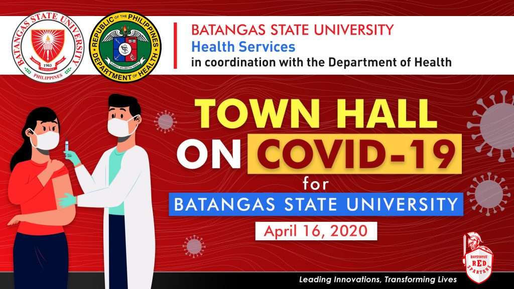 The Batangas State University, in coordination with the Department of Health (DOH) will be conducting a university-wide webinar on COVID-19 vaccination on April 16. Entitled “Town Hall on COVID-19 for Batangas State University”, the awareness webinar aims to orient and guide the whole Red Spartan community on matters regarding the COVID-19 vaccine, as spearheaded by the Health Services Office and Human Resource and Management Office, in coordination with DOH. The arrival of COVID-19 vaccines in the country is a major step in relation to the Philippine National Deployment and Vaccination Plan (NDVP) for COVID-19 Vaccines. Based from the recent surveys conducted by the Octa Research Group, there are still people who have yet to decide whether they will avail the available vaccines or not, because they are “not sure if the vaccine is safe and effective.” The Batangas State University, being an institution of higher learning, is one with the national government in ensuring a unified and coordinated vaccination campaign as provided under the NDVP. This is along with the end goal of undertaking proactive measures necessary to assure health and safety of all Filipinos. Representatives from DOH are invited speakers to the program to discuss facts that the public has to know about the COVID-19 vaccines.