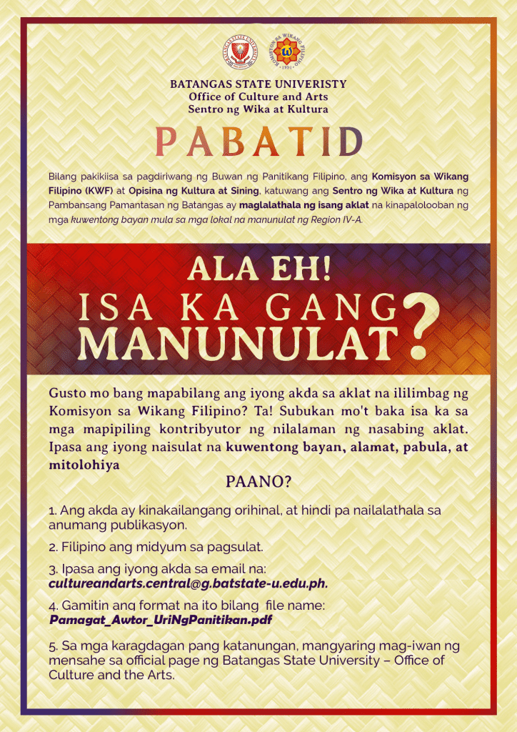 Bilang pakikiisa sa pagdiriwang ng Buwan ng Panitikang Filipino, ang Komisyon sa Wikang Filipino (KWF) at Opisina ng Kultura at Sining, katuwang ang Sentro ng Wika at Kultura ng Pambansang Pamantasan ng Batangas, ay maglalathala ng isang aklat na kinapalolooban ng mga kuwentong bayan mula sa mga lokal na manunulat ng Region IV-A. Ala eh! Isa ka bang manunulat? Gusto mo bang mapabilang ang iyong akda sa aklat na ililimbag ng Komisyon sa Wikang Filipino? Ta! Subukan mo’t baka isa ka sa mga mapipiling kontribyutor ng nilalaman ng nasabing aklat. Ipasa na ang iyong naisulat na kuwentong bayan, alamat, pabula, at mitolohiya. Paano? 1. Ang akda ay kinakailangang orihinal, at hindi pa nailalathala sa anumang publikasyon. 2. Filipino ang midyum sa pagsulat. 3. Ipasa ang iyong akda sa email na: cultureandarts.central@g.batstate-u.edu.ph. 4. Gamitin ang format na ito bilang file name: Pamagat_Awtor_UriNgPanitikan.pdf 5. Sa mga karagdagan pang katanungan, mangyaring mag-iwan ng mensahe sa official facebook page ng Batangas State University – Office of Culture and the Arts. #LeadingInnovations #TransformingLives #ZitoRedSpartans