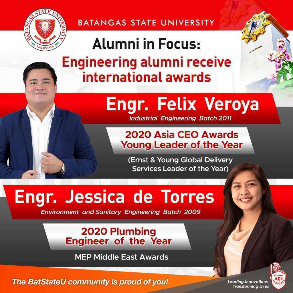 Engr. Felix Veroya and Engr. Jessica de Torres, both alumni of Batangas State University, received awards from international award-giving bodies this year. Engr. Veroya was awarded Young Leader of the Year (Ernst and Young Global Delivery Services Leader of the Year) at the 2020 Asia CEO Awards. He was also part of the Circle of Excellence finalists under the Entrepreneur of the Year category. The Asia CEO Awards is the largest business awards event in the Asia-Pacific region, honoring individuals and organizations in various business, innovation, leadership and development categories. A member of the university’s Industrial Engineering Class of 2011, Engr. Veroya graduated Cum Laude and was one of the recipients of the Ten Outstanding Students Award. He is the Founder and Chief Executive Officer of Ask Lex PH Academy, which provides professional training and consulting to individuals and organizations in the fields of Industrial Engineering, Innovation, Lean Six Sigma, Project Management and other similar domains. On the other hand, Engr. Jessica de Torres was awarded as Highly Commended Plumbing Engineer of the Year during the 2020 Mechanical, Electrical, and Plumbing (MEP) Middle East Awards. The MEP Middle East Awards is one of the most prestigious awards in the region that recognizes individuals and companies who have made distinct contributions to the sustainable development of the construction landscape in the Middle East. Engr. de Torres graduated with an Environment and Sanitary Engineering degree at Batangas State University in 2009. Based in the United Arab Emirates, she is currently a Senior Public Health Engineer of Ramboll, a leading engineering, architecture and consultancy company. She has expertise on sanitary design, water demand analysis, pump calculation, pipe sizing, and other relevant hydraulic calculation. The entire Batangas State University community congratulates its two alumni who have made a distinct mark in the global workplace. The Alumni-in-Focus project aims to highlight the university’s alumni and their achievements, which can serve as an inspiration to the young Red Spartans to realize their full potential. Do you know a BatStateU (formerly PBMIT) alumnus/ alumna whose achievements, accomplishments, philanthropy, or significant contributions can inspire students? Or do you know a BatStateU graduate who has a success story worth sharing to the community? Send us details via alumniaffairs@g.batstate-u.edu.ph or publicrelations@g.batstate-u.edu.ph. You may also message us in our official Facebook page: www.facebook.com/batstateupr