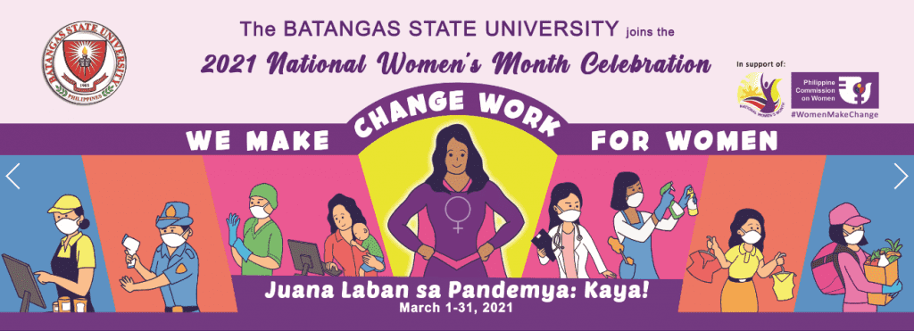 Batangas State University joins the celebration of 2021 National Women’s Month with the theme:We MAKE CHANGE Work for Women (2017-2022): Juana Laban sa Pandemya: Kaya! Show your support for GENDER EQUALITY and WOMEN EMPOWERMENT by joining #PurpleMondays! Take a photo or selfie wearing a purple shirt and post it on any social media platform. Don’t forget to use our official hashtags! #PurpleMondays #WomenMakeChange #InternationalWomensMonth2021