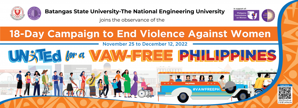Batangas State University-The National Engineering University is one with the international community and the Philippine Commission on Women (PCW) in advocating to stop and prevent Violence Against Women through the annual 18-Day Campaign to end VAW from November 25 to December 12, 2022. Bearing the theme “UNiTED for a VAW-free Philippines” which highlights the powerful impact of combining individual efforts towards a collaborative and united thrust towards a VAW-free Philippines, this year’s campaign include activities initiated by BatStateU Gender and Development (GAD) Office that endeavour to gauge the awareness of citizens on VAW and its forms and manifestations as well as underscore the gains attained in the journey towards a VAW-free community.