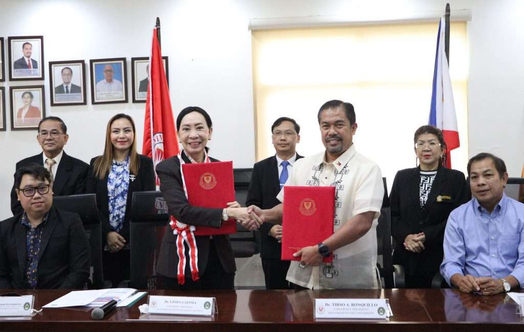 Batangas State University, The National Engineering University (BatStateU-The NEU) further strengthened its commitment to internationalization after signing a Memorandum of Understanding (MoU) with Bansomdejchaopraya Rajabhat University (BSRU) on January 9. BSRU is a public higher educational institution which is among the top 60 universities in Thailand. It offers a wide range of undergraduate degree programs under its six faculties: Science and Technology, Education, Management Science, Humanities and Social Sciences, Music, Engineering and Industrial Technology. Additionally, this institution provides 14 Master’s and seven Ph.D. degree programs, as well as a Graduate Diploma program for Teacher Training. BatStateU-The NEU President Dr. Tirso A. Ronquillo and BSRU President Dr. Linda Gainma led the ceremonial MoU signing, which symbolizes the partnership between the two universities in academic collaboration. These include the conduct of academic, research, and community services; the development of joint research, publication, seminar, and conference; the exchange of faculty members, staff members, and students for both short and long terms; and the conduct of cultural activities. This initiative is aligned with the attainment of Sustainable Development Goals particularly SDG 4 (Quality Education), SDG 8 (Decent Work and Economic Growth), SDG 10 (Reduced Inequalities), and SDG 17 (Partnerships for the Goals). “I am delighted about this partnership as it will bring visibility, credibility and prestige to an initiative. I know that it will demonstrate a strong commitment towards ensuring students and staff access to mentorship, experiential learning, equity, inclusivity and even exposure to new challenges and perspectives, and this is something I am truly excited about,” Dr. Ronquillo articulated. Both Higher Educational Institutions (HEIs) set out to establish an institute of learning for teacher and human development towards producing communicative, skillful, and multicultural-trained graduates. In parallel, BatStateU-The NEU and BSRU agreed to conduct collaborative research projects among faculty, engage in Student Visits and Exchange and Teaching Internship Exchange, and hold webinars/seminars and training to empower and inspire the next generation of leaders, to improve the lives of professionals and to serve as stewards of the best practices in teacher education program. BatStateU-The NEU is also open to exploring other prospective opportunities with BSRU in other relevant projects and initiatives that will enhance the education of their students, increase research accomplishments, broaden the knowledge base of their faculty, and promote mutual understanding and enlightenment of the people of their respective countries. BSRU delegates, including Vice President Dr. Sutipporn Chotratanasak, Vice President Assoc. Prof. Sayan Puttala, Asst. President Dr. Suriya Phankosol, Chairman of Academic Services Project Assoc. Prof. Somchai Promsuwan, Chairman of Doctoral Programme in Curriculum and Instruction Dr. Areewan Iamsa-Ard, Director of Office of International Affairs and ASEAN Network Dr. Kulsirin Aphiratvoradej, Dean of Graduate School of Dr. Kanakorn Sawangcharoen, Deputy Deans of Graduate School Dr. Nainapas Injoungjirakit and Asst. Prof. Akaranun Asavarutpokin, and Deputy Director of Office of International Affairs and ASEAN Network Asst. Prof. Chalermsup Karamjakwut also graced the ceremonial MoU signing. Also present is Dr. Teodorica G. Ani, Director of External Affairs from BatStateU Central, along with other BatStateU officials from the Malvar campus, including Chancellor Dr. Philip Y. Del Rosario, Vice Chancellor for Development and External Affairs Dr. Sharon G. Angulo, Vice Chancellor for Academic Affairs Dr. Amado C. Gequinto, Dean of College of Teacher Education Dr. Nora V. Marasigan, Head of External Affairs Dr. Romel M. Aceron and Focal Person in Internationalization in Action of CTE Dr. Genalyn P. Lualhati. Preview in new tab