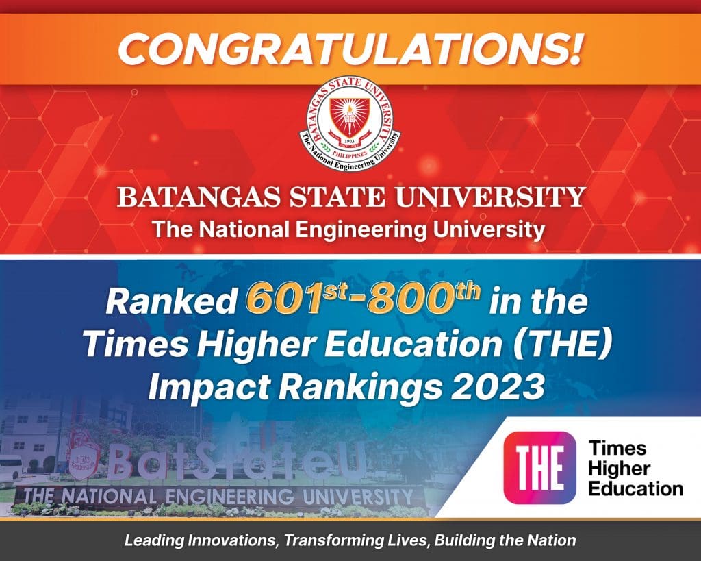 On the heels of its recent recognition in the Top 100 Global Innovative Universities, Batangas State University, The National Engineering University secured a 601st-800th spot among 1,591 universities from 112 countries/regions in the Impact Rankings of the Times Higher Education (THE), released June 1, 2023. It emerged 4th highest-ranked University among universities in the Philippines. The THE Impact Rankings is the first global attempt to measure the contributions of universities worldwide to the 17 UN Sustainable Development Goals (SDGs) through research, stewardship, outreach, and teaching. The University is recognized for its significant initiatives in advancing SDG 14 (Life Below Water), crediting especially the University’s efforts in protecting, conserving, and strategically managing the Verde Island Passage (VIP), landing in the Global Top 200 most impactful programs. Meanwhile, BatStateU-The NEU’s programs in contributing to SDG 2 (Zero Hunger), SDG 5 (Gender Equality), SDG 6 (Clean Water and Sanitation), SDG 12 (Responsible Consumption), and SDG 15 (Life on Land) have been recognized as some of the world’s best initiatives, ranking within the Top 400. BatStateU-The NEU is ranked in all 17 SDGs, thereby affirming its position as one of the leading institutions of higher learning that contributes to attaining the global goals. BatStateU-The NEU’s ranks in the other SDGs are: Top 600 in SDG 13 (Climate Action), and Top 800 in SDG 4 (Quality Education), SDG 8 (Decent Work and Economic Growth), SDG 10 (Reduced Inequalities), SDG 11 (Sustainable Cities and Communities), and SDG 16 (Peace, Justice, and Strong Institutions). The University is also acknowledged in the Top 800+ in SDG 9 (Industry, Innovation, and Infrastructure) and among the Top 1000 in SDG 3 (Good Health and Well-Being). “As the University receives this third international recognition of our efforts to engineer a sustainable world, along with UI GreenMetric and World University Ranking for Innovations (WURI), our commitment to make a lasting impact not only in the country but all over the world is intensified. We are more determined to put forward innovative programs designed to strategically address the pressing needs of today while upholding the importance of safeguarding future generations,” asserted Dr. Tirso A. Ronquillo, University President. Batangas State University is the Philippines’ National Engineering University, by virtue of R.A. 11694, and is a Level IV State University. Regarded as the country’s largest engineering university, BatStateU-The NEU is the first and thus far the only state university in the Philippines with engineering, IT, and computer science programs accredited by the Accreditation Board for Engineering and Technology (ABET) – Engineering Accreditation Commission and Computing Accreditation Commission. The University was recently ranked 351st Most Sustainable University in the world by the UI GreenMetric World University Rankings in 2022 and the 90th Most Innovative University globally by WURI earlier this 2023. For the full rankings and methodology of the THE Impact Rankings, detailed information can be accessed at the THE Website.