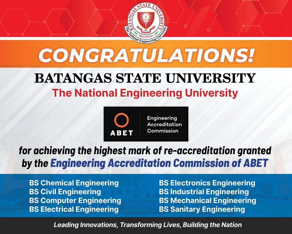 BATANGAS CITY—Batangas State University (BatStateU), recognized as the Philippines’ National Engineering University, proudly announces that eight of its engineering programs have achieved the highest mark of re-accreditation from the Engineering Accreditation Commission (EAC) of the Accreditation Board for Engineering and Technology (ABET). Based in Baltimore, Maryland, USA, ABET is a global accreditor for college and university programs in applied and natural sciences, computing, engineering, and engineering technology. This prestigious accreditation was officially posted on the ABET website on October 1, 2023. The exceptional quality of BatStateU’s engineering programs was underscored by a comprehensive evaluation conducted by experts and representatives from EAC-ABET. These assessments took place during an extensive visit to the Philippines from November 13 to 15, 2022. The outcome reaffirmed the paramount significance of ABET accreditation and verified that BatStateU’s engineering programs consistently meet rigorous standards. These ABET-accredited programs include BS Chemical Engineering, BS Civil Engineering, BS Computer Engineering, BS Electrical Engineering, BS Electronics Engineering, BS Industrial Engineering, BS Mechanical Engineering, and BS Sanitary Engineering. BatStateU, renowned for its engineering education excellence, has produced over 180 engineering board topnotchers, cementing its position as the country’s largest engineering university, offering 46 engineering degree programs, the highest among higher education institutions (HEIs) nationwide. Additionally, the university offers 27 emerging programs in engineering and allied fields, showcasing its dedication to staying at the forefront of educational excellence. Notably, BatStateU is the first and, thus far, the only state university in the Philippines with engineering programs accredited by ABET. “This ABET accreditation serves as a compelling affirmation of BatStateU’s commitment to providing world-class engineering education at par with other global engineering universities. It assures that our graduates from these programs are not only well-equipped to excel in critical technical fields but also primed to drive innovation and proactively meet the imperatives of the global knowledge economy,” University President Dr. Tirso A. Ronquillo shared. Sought worldwide, ABET’s voluntary peer-review process enjoys global recognition for enhancing the quality, precision, and safety of academic programs in technical disciplines. This rigorous assessment is carried out by teams of experts from industry, academia, and government, focusing on evaluating program curricula, faculty expertise, facilities, and institutional support. To check the EAC-ABET accredited programs of Batangas State University, kindly visit this link: https://www.abet.org/. For more information about the Philippines’ National Engineering University, please visit www.batstate-u.edu.ph/about/