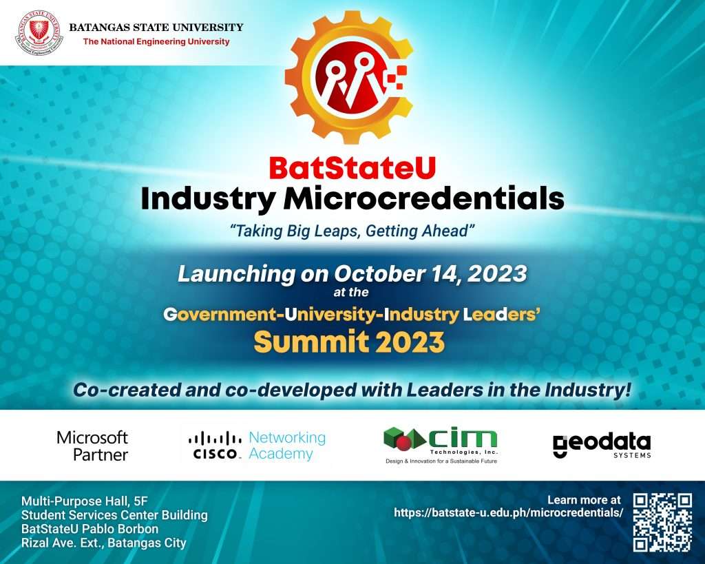 In the ever-shifting job market landscape, the demand for specialized skills and knowledge has reached unprecedented heights. It’s a world where the traditional rules no longer apply. To navigate this new reality, Batangas State University (BatStateU), in a groundbreaking collaboration with industry leaders, has introduced an educational innovation set to revolutionize career development: BatStateU Industry Microcredentials. These agile, compact courses are tailored to meet the demands of an ever-evolving industry and empower learners with the tools they need to excel. More agile and streamlined than traditional degrees, BatStateU Industry Microcredentials represent the answer to swiftly acquiring the skills necessary to take big leaps and meet immediate industry demands. These bite-sized courses provide a focused and efficient path to mastering competencies aligned with one’s career aspirations. The BatStateU Industry Microcredentials exemplify this innovative approach to learning, empowering students to get ahead toward their professional goals. What sets BatStateU Industry Microcredentials apart is that these programs in Data Security, Cybersecurity, Project Management, Internet of Things (IoT), Building Information Modeling, and Geographic Information System (GIS) are co-created and co-delivered with leaders in the industry. This close collaboration with Microsoft, Cisco Networking Academy, CGTD, Inc., CIM Technologies, Inc., and Geodata Systems ensures that each microcredential course undergoes validation in consultation with industry stakeholders, thus maintaining consistently high-quality standards. Recognizing the importance that education should be as adaptable as the world we live in, BatStateU Industry Microcredentials are designed to be flexible and dynamic, ensuring they keep pace with the ever-shifting landscape of industry demands. They offer inclusivity, expanding educational access to a broader audience and contributing significantly to cultivating a diverse workforce. Completers of these microcredential programs are equipped with valuable skills and receive verifiable credentials in the form of badges. These credentials can be showcased on professional networks or online job market platforms, enhancing their employability and promoting their professional expertise. Furthermore, a collaborative assessment process involving industry experts and the University ensures a comprehensive evaluation of competencies, enhancing the value and recognition of the microcredentials. Aligned seamlessly with the goals outlined in the Philippine Development Plan (2023-2028), BatStateU Industry Microcredentials signify a significant stride toward a future where education remains in sync with progress. It equips and empowers individuals to flourish in an ever-evolving and dynamic world. The time is now to propel yourself into a future of opportunities! On October 14, 2023, mark the beginning of your transformation. Take big leaps and get ahead with BatStateU Industry Microcredentials. Your exciting future starts here!
