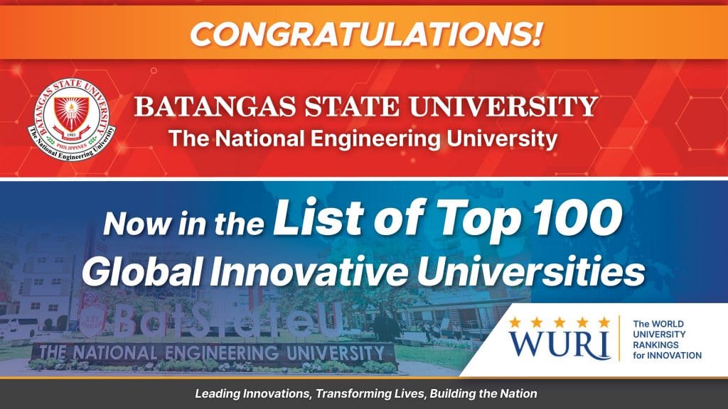 True to its dictum “Leading Innovations”, Batangas State University, The National Engineering University (BatStateU-The NEU) was recognized as the 90th most innovative university in the globe by the prestigious World University Rankings for Innovation (WURI) 2023. As a ranking system that evaluates the university’s real contributions to the society, highlighting creative and innovative approaches of universities’ research and educational programs, WURI 2023 has taken cognizance of the University’s innovative programs and initiatives such as: the Knowledge, Innovation and Science Technology (KIST) Park, Verde Island Passage Center for Oceanographic Research and Aquatic Life Sciences (VIP CORALS), and Center for Sustainable Development (CSD) which all entered in the global top 50 in the fourth industrial revolution (27th), ethical value (31st), and student mobility and openness categories (47th). “More than global recognition, this milestone affirms our strong commitment to making lasting impact to the society and engineering the future towards national development. Aggressively, we will continue leading innovations, transforming lives, and building the nation through our pioneering and impactful programs and initiatives”, said Dr. Tirso A. Ronquillo, University President. Other innovative programs and projects of the University which were instrumental in securing its WURI 2023 spot are the Adaptive Capacity-building and Technology Innovation for Occupational Hazards and Natural Disaster (ACTION) Center, and Center for Technopreneurship and Innovation (CTI) which are under the crisis management and entrepreneurial spirit categories respectively. Just last January, the BatStateU-The NEU ranked as the 351st most sustainable university in the world under the 2022 UI GreenMetric World University Rankings which reflects the University’s strong commitment to contribute to a more sustainable world. The full results of the 2023 World Rankings of Innovative Universities are available at this link: www.wuri.world/wuri-ranking-2023. #LeadingInnovations #TransformingLives #BuildingtheNation