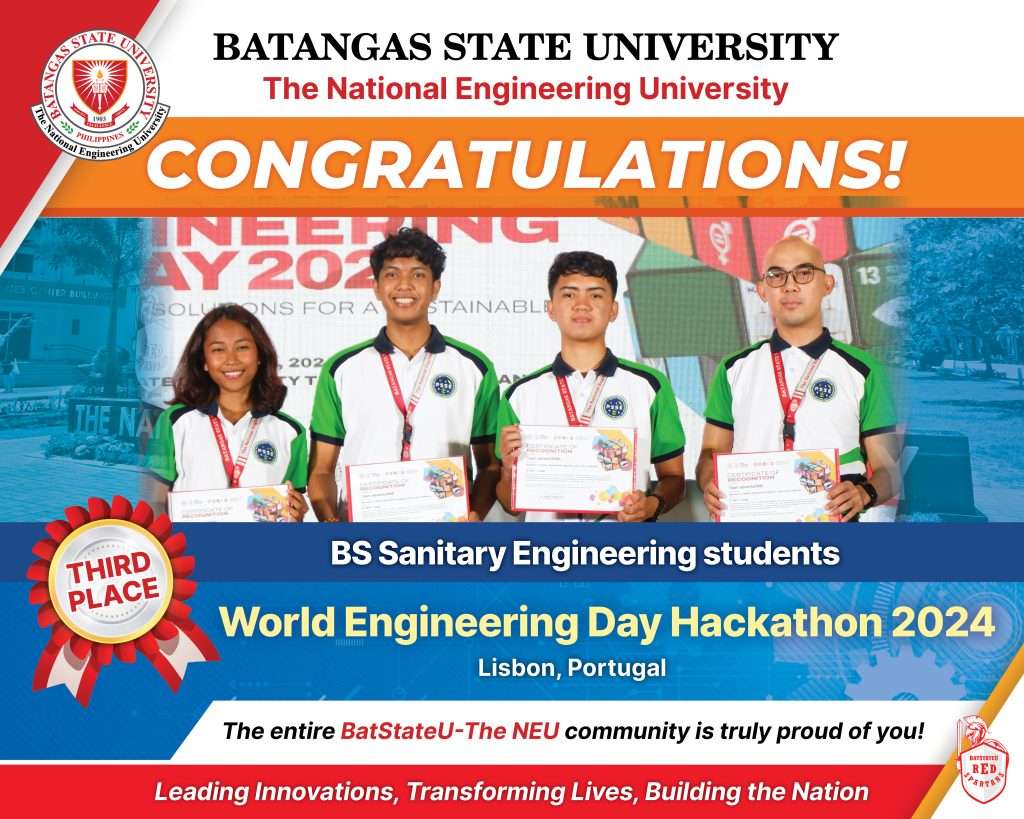 Batangas State University, The National Engineering University (BatStateU), proudly announces the remarkable achievement of its BS Sanitary Engineering students at the World Engineering Day (WED) Hackathon on March 4. Amidst fierce competition from engineering talents worldwide, Team AdventURINE from BatStateU Alangilan Campus secured 3rd place, raising the flag of the Philippines high on the global stage. The winners were broadcast during a 24-hour global stream hosted by emcees in Australia and Lisbon, Portugal, substantially boosting the international acknowledgment of their impressive feat. Organized annually by UNESCO, in collaboration with Engineers Without Borders International (EWB-I) and The Big Creative, the WED Hackathon represents a global initiative for cooperation and innovation in engineering. With over 2,500 students from more than 35 countries participating, this year focuses on Climate Action, resonating with Sustainable Development Goal 12. The challenges were designed to stimulate inventive solutions to some of the world’s most pressing environmental issues. Team AdventURINE, led by Jose Luis A. Valencia, Nathaniel M. Regodon, and Maureen H. Fadullo, and guided by their mentor Dr. Mark Sibag, showcased their innovative design, “Green Sustainable Phyto-fence Assembled using Cured Source-collected Urine for Urban Environmental Balance (SPACE).” Their solution, a sustainable phyto-fence constructed from treated source-collected urine, addresses Challenge 3: Protecting the Most Vulnerable from Extreme Heat in Refugee Camps and Temporary Shelters. Their project ingeniously addresses the vital need for cooling in temporary settlements and improving hygiene and sanitation. By encouraging the use of designated urinals and treating collected urine for microalgae cultivation, they create a closed-loop system that promotes both urban living needs and ecological balance. Significantly, this solution is powered entirely by solar energy, reducing dependence on fossil fuels and enhancing climate-friendly initiatives. Through their approach, Team AdventURINE demonstrates the power of innovation to address complex challenges while prioritizing sustainability and environmental stewardship. “The dedication and creativity exhibited by Team AdventURINE exemplify the spirit of innovation and problem-solving that we strive to cultivate at Batangas State University,” remarked BatStateU President Dr. Tirso A. Ronquillo. “Their success on the global stage upholds our commitment to nurturing excellence in engineering education and research,” he added. As a mark of their exemplary achievement, Team AdventURINE was awarded a prize of €1,000, acknowledging their impactful work in advancing sustainable solutions for a better world. Following closely behind, Team EcoCool, comprising scholars from Hong Kong University of Science and Technology, University of Illinois Urbana-Champaign, Tokyo Institute of Technology, and Rice University (US), secured second place. Meanwhile, Team Somiant from Yachay Tech University, Ecuador, claimed the top position. Batangas State University warmly congratulates Team AdventURINE for their peerless performance at the WED Hackathon 2024, bringing glory to the institution and the Philippines and highlighting the country’s growing influence in global engineering innovation. For more information about the World Engineering Day Hackathon, please visit: https://worldengineeringday.net/hackathon/ Batangas State University is the Philippines’ National Engineering University by virtue of Republic Act No. 11694; renowned for its engineering education excellence, this Level-IV state university has produced over 180 engineering board topnotchers, cementing its position as the country’s largest engineering university. Notably, BatStateU is the first state university with engineering programs accredited by the Philippine Technological Council through its Accreditation and Certification Board for Engineering and Technology (PTC-ACBET), and the first and, thus far, the only state university in the Philippines with engineering and computing programs accredited by the Accreditation Board for Engineering and Technology (ABET) Engineering Accreditation Commission and Computing Accreditation Commission. Batangas State University. (BatStateU) has earned three stars in the QS Stars Rating. Furthermore, it was ranked as the 300th World’s Most Sustainable University in the 2023 UI GreenMetric World University Rankings and is also recognized as the 90th most innovative University globally in the prestigious World University Rankings for Innovation (WURI) 2023 and secured a notable ranking between 601st-800th among 1,591 universities from 112 countries/regions in the THE Impact Rankings 2023.